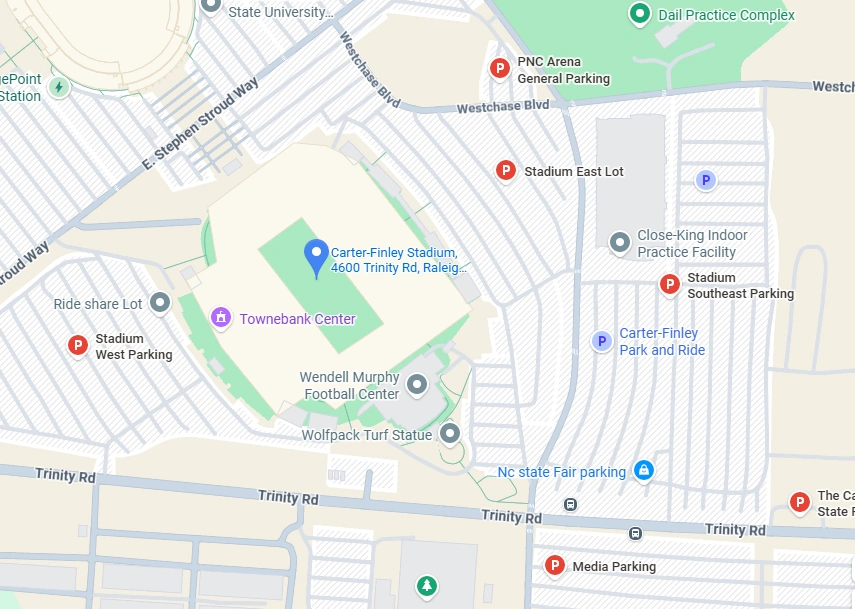 - » From the West: Take 1-40 East to the Wade Avenue exit; Exit at Edwards Mill Rd. or Blue Ridge Rd. and follow the signs to Carter-Finley Stadium.
